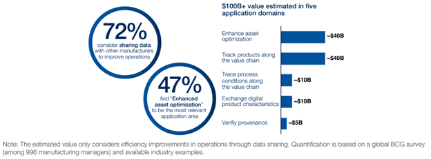 Enhancing asset optimization was defined as combining data from multiple users of the same type of machinery allowing manufacturers to improve algorithms that, for example, enable predictive maintenance. Sharing data can thus optimize asset performance by increasing machine uptime and product quality, creating a win-win situation for all stakeholders. This is particularly important for manufacturers who lack the amount of data needed to fuel robust analytics algorithms. Coupled with the value estimated in this application area of 40 billion $ a no-brainer to invest in. Yet, as also addressed by Commission President Ursula von der Leyen in the State of the Union in 2020 “the reality is that 80% of industrial data is still collected and never used. This is pure waste.”. Trust, knowledge and technical barriers prevent this (more on this later!).