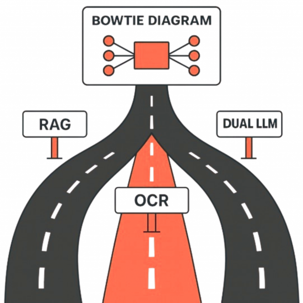 Dual LLM Pipeline: Combines vision and text models where the OCR extraction of tables & text is handled by a larger vision enabled model. - Output: A structured Bowtie diagram in JSON format, ready to render visually.