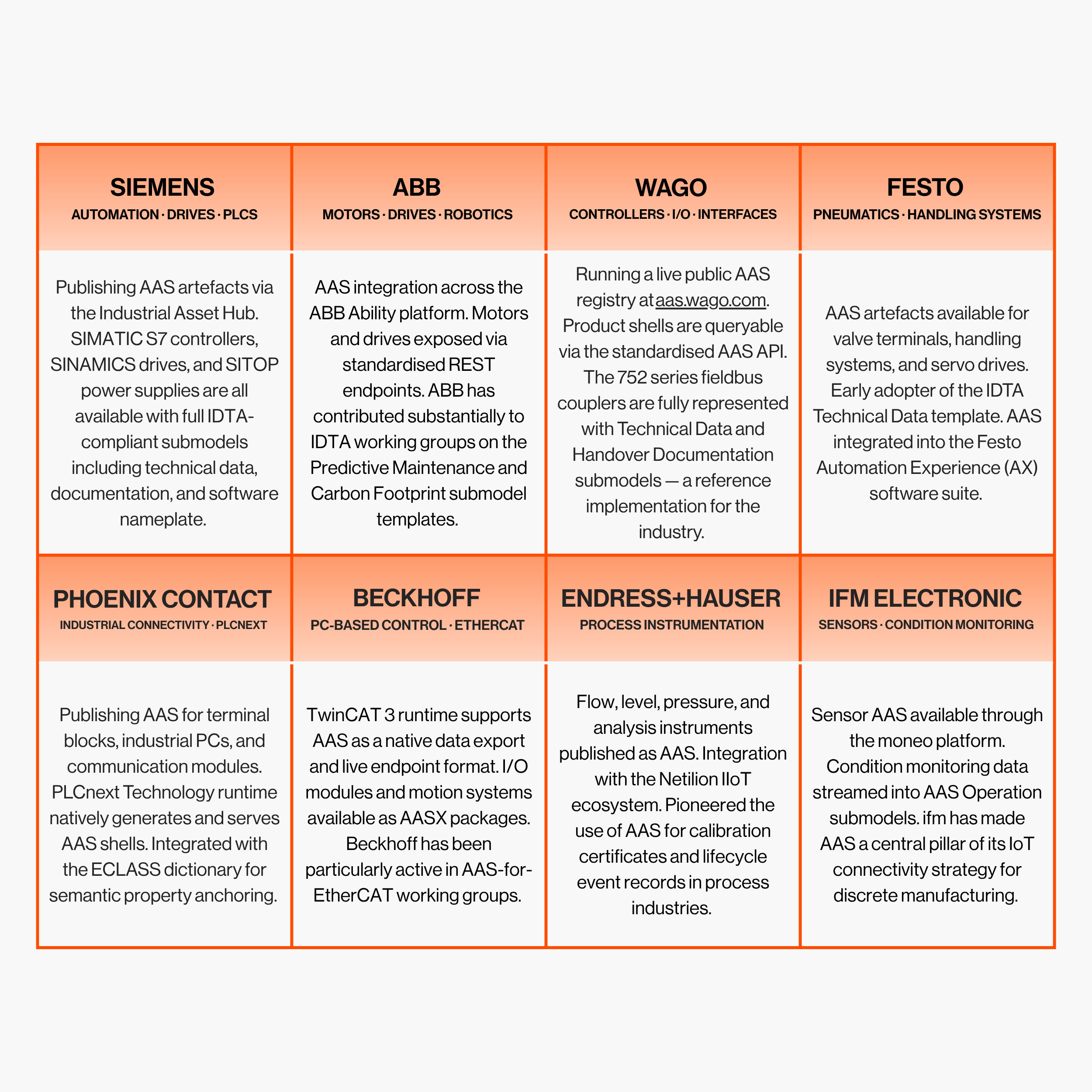 To my current knowledge the only vendor that lists with a fully open, no-login-required, directly queryable public AAS registry is WAGO. The others distribute AAS artefacts through support portals, product download pages, or platform-gated environments where the specific URLs either require authentication or change with product catalogue updates.