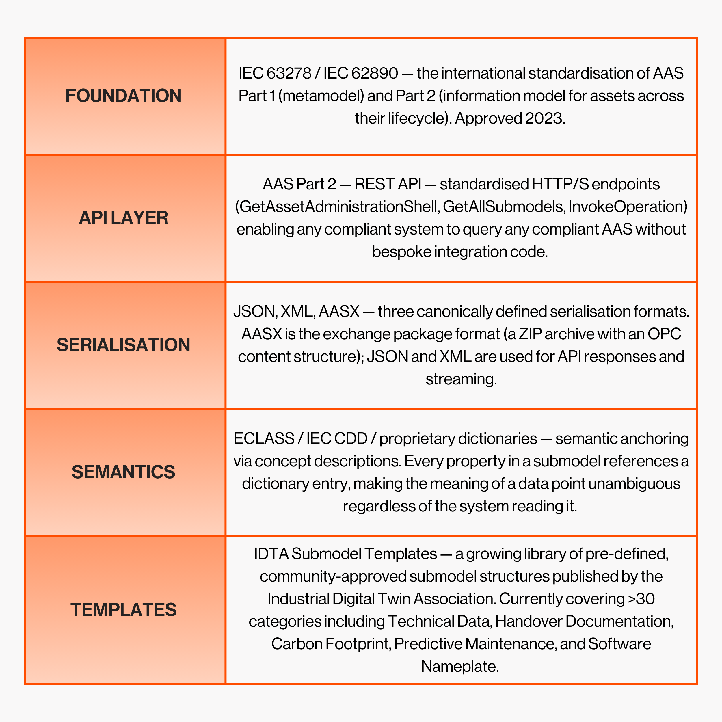 Despite these frictions, the trajectory is clear. AAS has moved from consortium aspiration to production infrastructure in the space of five years. The combination of IEC standardisation, IDTA template governance, open-source middleware, and an expanding gallery of real product shells from leading manufacturers has created a genuine network effect. Every new shell published by a manufacturer increases the value of every AAS-capable software platform. Every software platform that consumes AAS increases the incentive for manufacturers to publish. The flywheel is spinning.