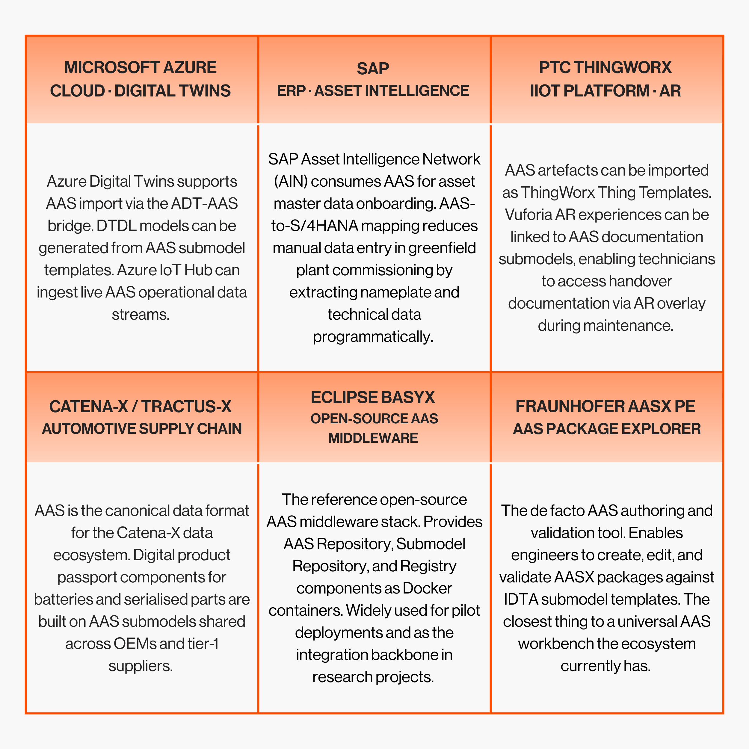 The vendor landscape around AAS has matured from a handful of research-adjacent pilots into a broad ecosystem spanning automation OEMs, industrial software platforms, cloud hyperscalers, and specialist analytics companies. Support takes three distinct forms: publishing AAS artefacts for physical products, embedding AAS as a first-class data format in software platforms, and providing tooling for creating, managing, and querying shells.