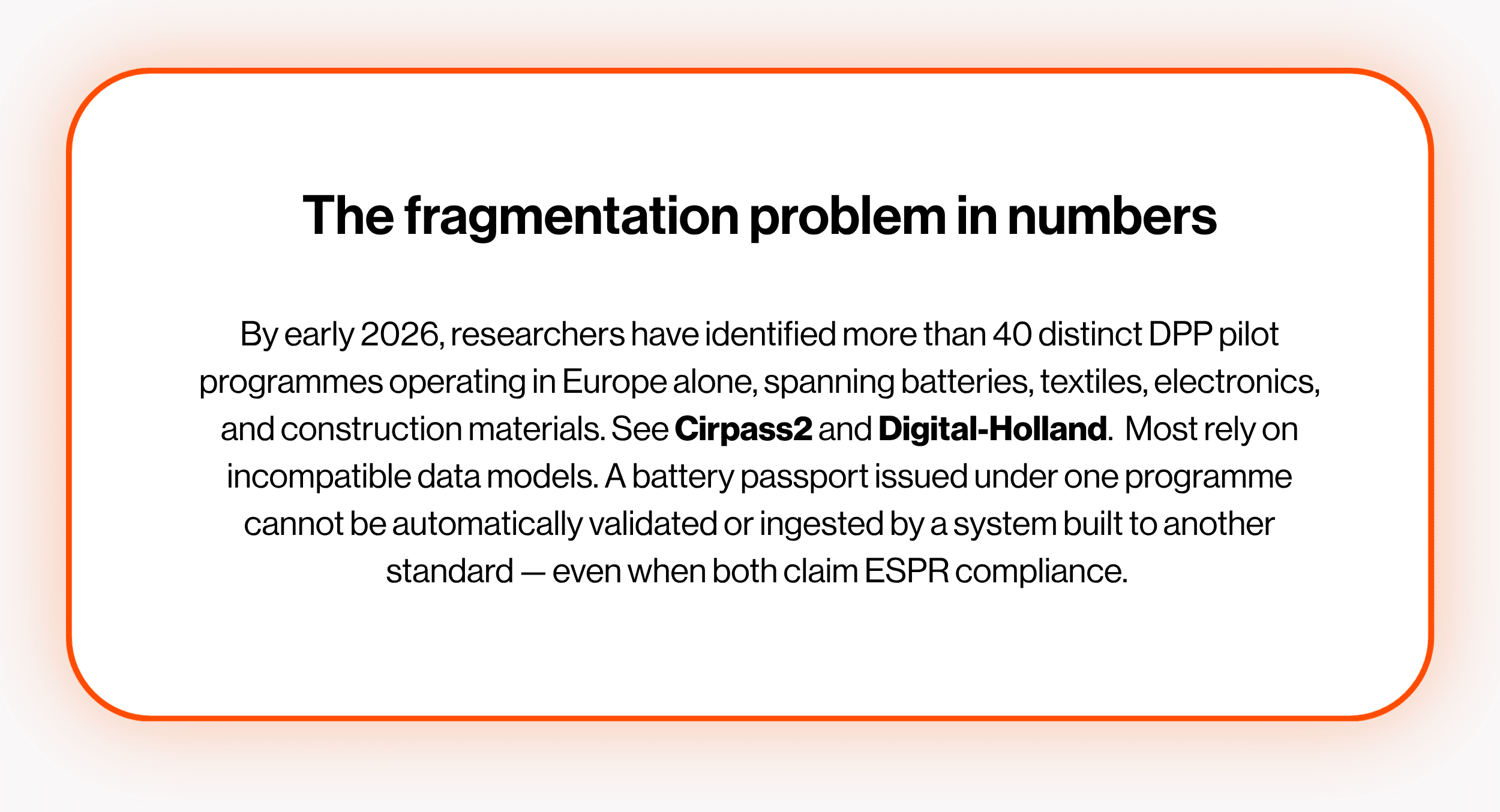 What the regulation has not — yet — mandated in full operational detail is a single place to find all of these passports. In the meantime, producers, industry consortia, and national governments have been building their own registries and data intermediaries. The result is a proliferating ecosystem of pilot programmes, sector-specific databases, and proprietary platforms that each work slightly differently and largely cannot talk to each other.
