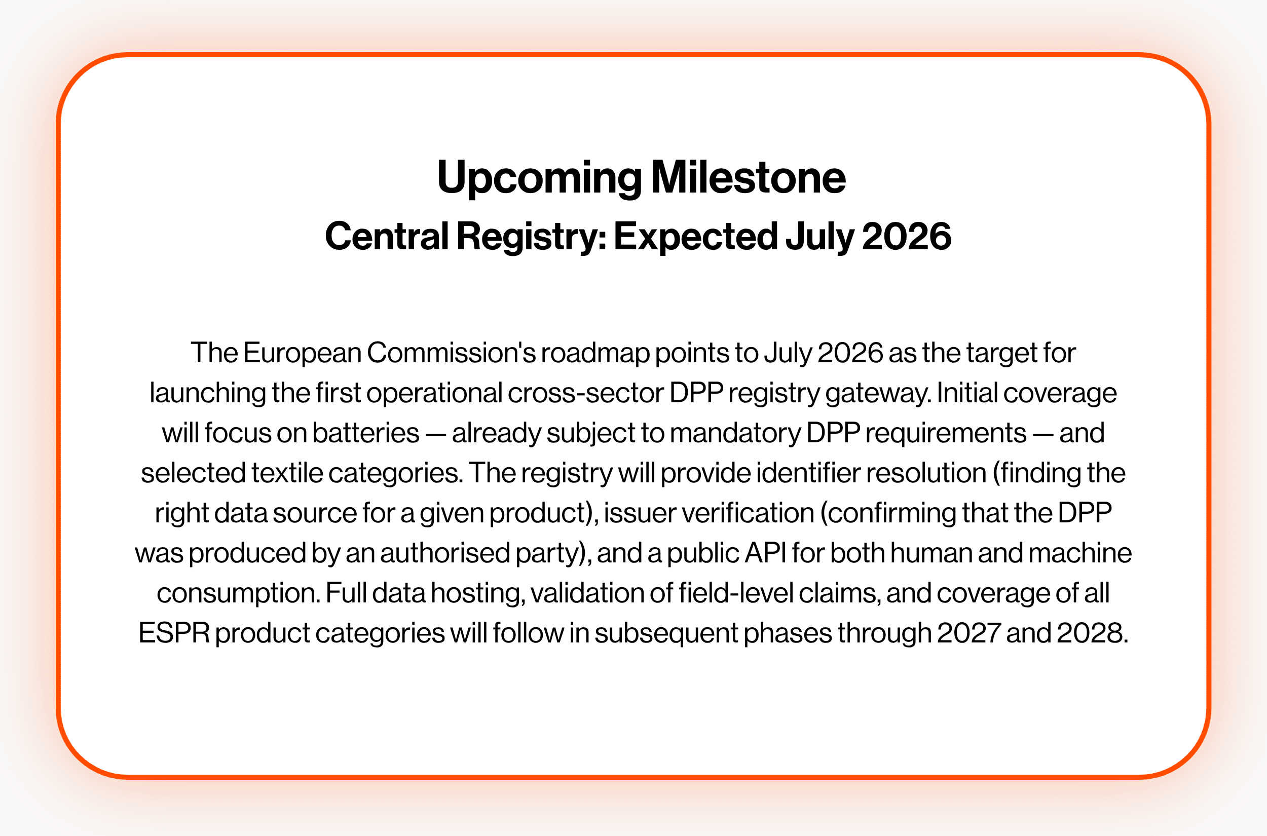 Several important caveats apply to that timeline. First, “launch” in this context will almost certainly mean a production-ready pilot rather than a fully scaled system capable of ingesting the millions of DPPs that a complete roll-out would eventually require. Second, the July date is contingent on political and procurement processes that have already slipped before; it represents the current best estimate, not a contractual guarantee. Third, even a functioning registry gateway will not resolve the underlying fragmentation of data quality — a registry can tell you where to find a passport and who signed it, but it cannot force manufacturers to populate it with accurate or complete data.