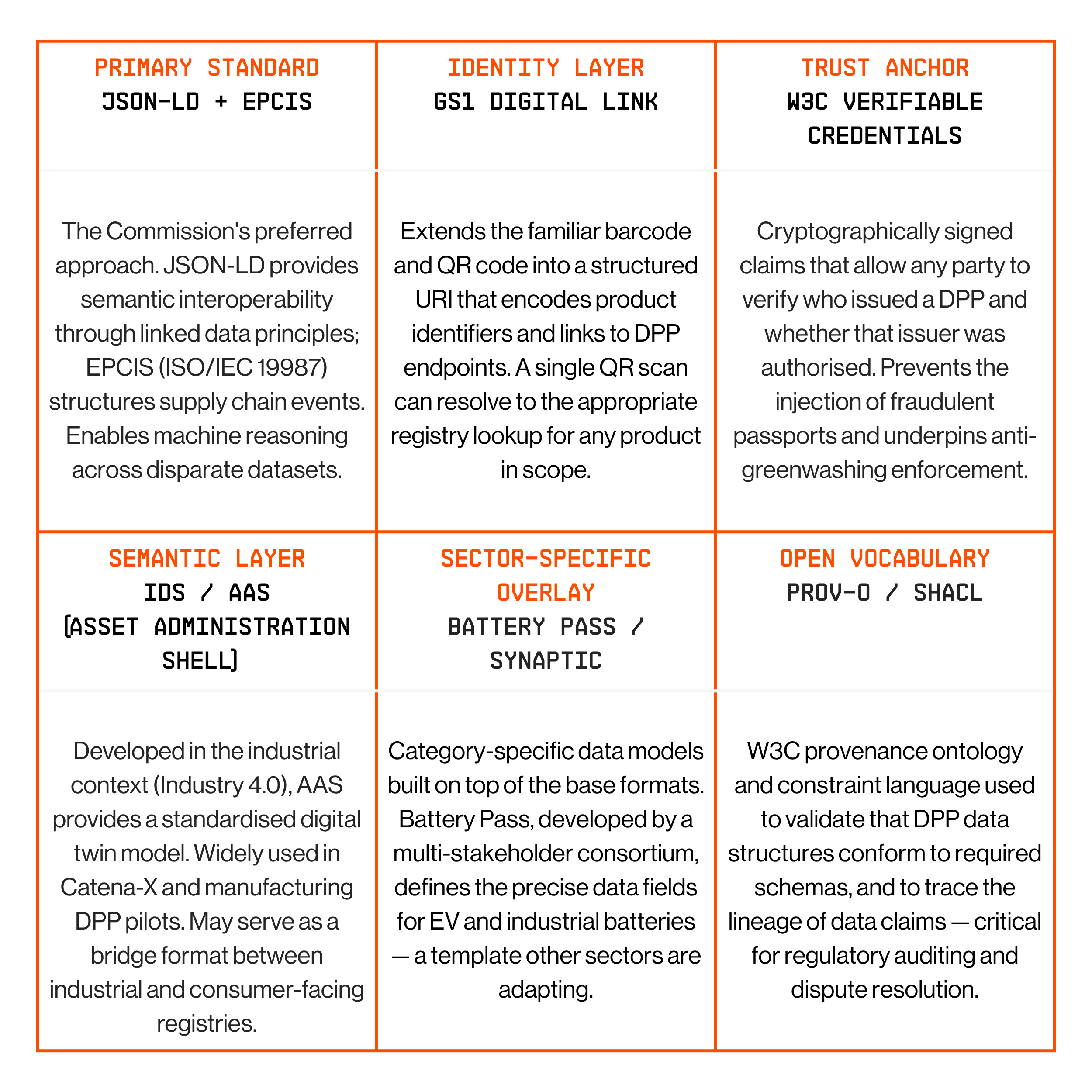 The likely outcome from July 2026 onwards is not a single mandatory format but a mandatory mapping layer: producers may submit data in any of the accredited formats, and the registry translates between them using published crosswalks. This is politically pragmatic — it allows existing pilots and sectoral systems to onboard without rebuilding from scratch — but it introduces complexity at the registry level and risks inconsistency in edge cases.
